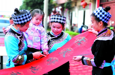 2月1日,搬迁群众在贵州省黔南布依族苗族自治州罗甸县红水河镇红河村晾晒春联。    春节临近,贵州省黔南布依族苗族自治州罗甸县红水河镇红河村群众打糍粑、贴春联、挂红灯笼,喜迎农历新年。