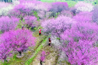 2月19日,在位于浙江省湖州市长兴县龙山街道的东方梅园,农民采摘梅花,准备制作香水(无人机照片)。 当日是雨水节气,各地农民抢抓农时忙农事,田间地头一派生机勃勃的农忙景象。 新华社发(谭云俸/摄)