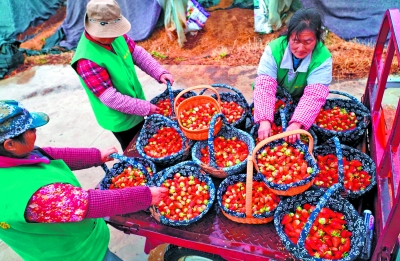 近日,山东省枣庄市的大棚草莓种植户忙着采摘成熟的草莓。近年来,枣庄发展大棚草莓种植产业,帮助农民拓宽增收渠道。