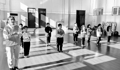团队的两名队员先为小朋友们整体演示了一遍《成语拜新年》手势舞,然后再逐步分解动作,教他们如何合着音乐表演。