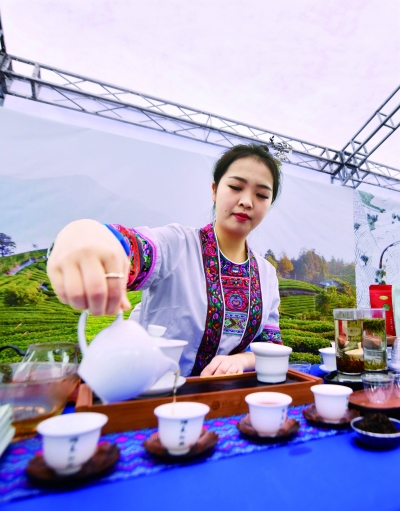 3月14日,在广西壮族自治区柳州市三江侗族自治县八江镇布央村,村民在展示茶艺。 当日,2024年中国三江早春茶大会暨广西柳州三江茶文化活动在三江侗族自治县八江镇布央村开幕。在为期两天的会期中,当地将举办春茶开采仪式、茶文化展演、产销对接签约、技术交流等活动,致力提升三江茶叶品牌,推动茶产业高质量发展。 新华社记者 黄孝邦/摄