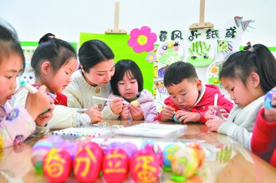 3月19日,在湖北省襄阳市保康县一家幼儿园,老师指导小朋友绘制彩蛋。 春分节气临近,各地通过立蛋、做风筝等民俗活动,迎接春分到来。 新华社发(杨韬/摄)
