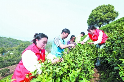 4月1日,在长兴县和平镇长岗村的茶山上,志愿者帮助人手不足的茶农采摘春茶。 近期,浙江省湖州市长兴县和平镇的10万亩白茶进入开采季,自河南、安徽、江西等地的约10万名采茶工进入和平镇采摘春茶。和平镇当地多部门组织党员志愿者到各村的茶园提供安全防范宣传、健康体检服务等多种志愿服务,为采茶季护航,助力茶叶采摘、销售。 目前,长兴县和平镇茶叶种植总面积近10万亩,茶叶加工企业以及茶场268家。茶叶成了当地百姓增收致富的支柱产业。 新华社记者 徐昱/摄