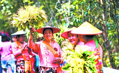 4月11日,当地百姓在展示山上采来的“赏建”花。    云南德宏傣族景颇族自治州即将迎来一年一度的泼水节。在每年泼水节的前一天,当地傣族、德昂族同胞都会举行采花祈福仪式。采花扮龙头是泼水节中最古老的传统习俗之一,身着盛装的少数民族同胞,上山采摘一种名为“赏建”的植物,祈求来年风调雨顺。新华社记者