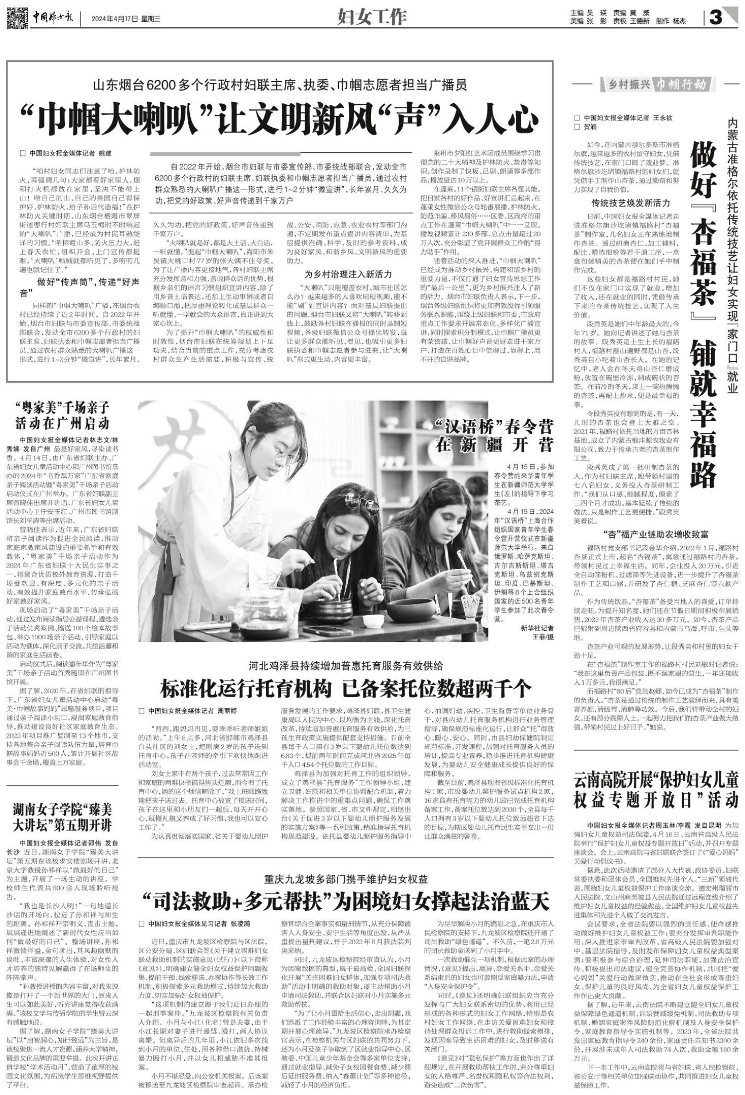 《中国妇女报》(电子版)的一切内容(包括但不限于文字、图片、PDF、图表、标志、标识、商标、版面设计、专栏目录与名称、内容分类标准以及为读者提供的任何信息)仅供中国妇女报读者阅读、学习研究使用,未经中国妇女报及/或相关权利人书面授权,任何单位及个人不得将《中国妇女报》(电子版)所登载、发布的内容用于商业性目的,包括但不限于转载、复制、发行、制作光盘、数据库、触摸展示等行为方式,或将之在非本站所属的服务器上作镜像。否则,中国妇女报将采取包括但不限于网上公示、向有关部门举报、诉讼等一切合法手段,追究侵权者的法律责任。