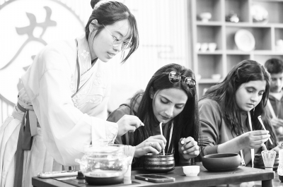 4月15日,参加春令营的来华青年学生在新疆师范大学学生(左)的指导下学习茶艺。 4月15日,2024年“汉语桥”上海合作组织国家青年学生春令营开营仪式在新疆师范大学举行。来自俄罗斯、哈萨克斯坦、吉尔吉斯斯坦、塔吉克斯坦、乌兹别克斯坦、印度、巴基斯坦、伊朗等8个上合组织国家的近500名青年学生参加了此次春令营。新华社记者