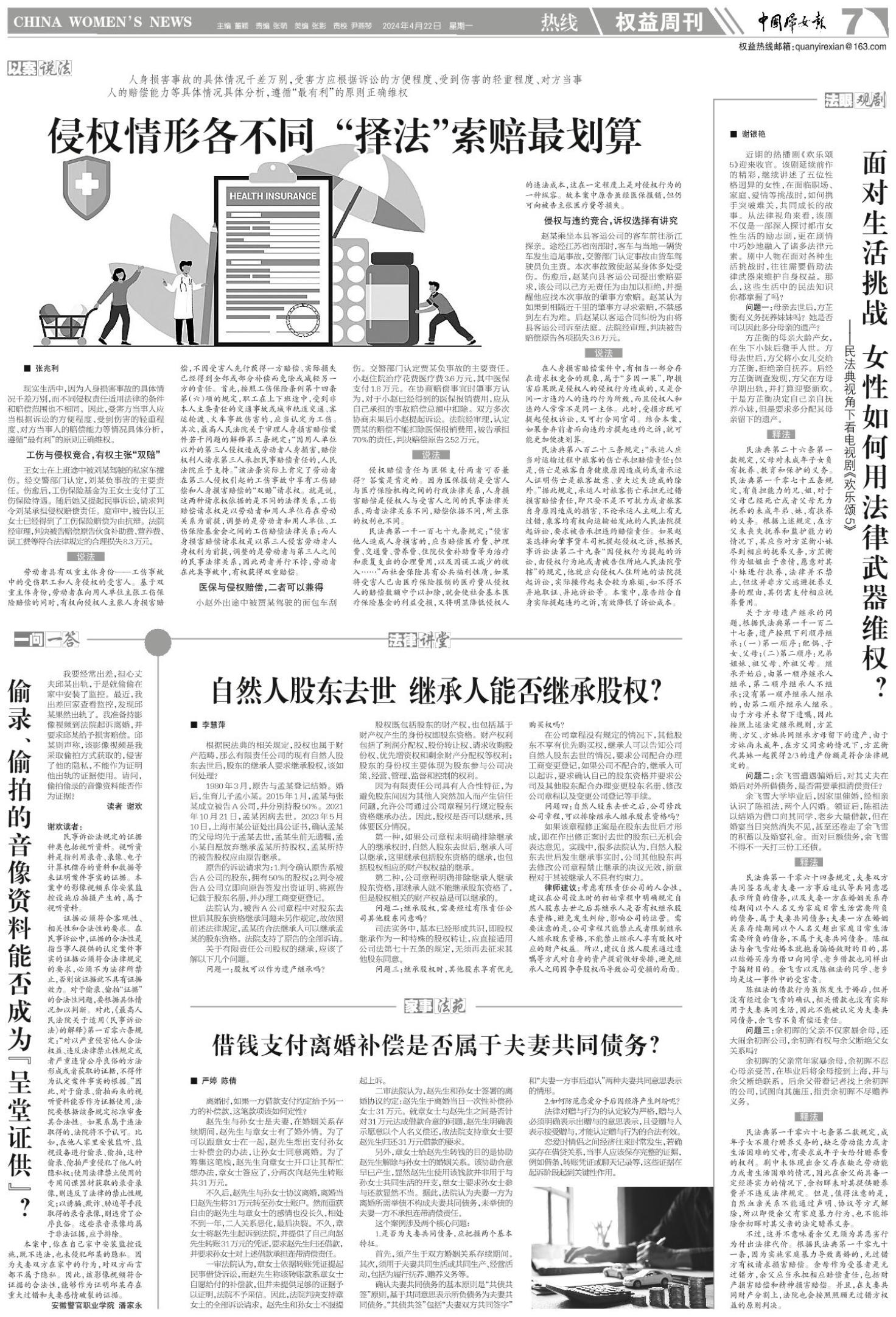 《中国妇女报》(电子版)的一切内容(包括但不限于文字、图片、PDF、图表、标志、标识、商标、版面设计、专栏目录与名称、内容分类标准以及为读者提供的任何信息)仅供中国妇女报读者阅读、学习研究使用,未经中国妇女报及/或相关权利人书面授权,任何单位及个人不得将《中国妇女报》(电子版)所登载、发布的内容用于商业性目的,包括但不限于转载、复制、发行、制作光盘、数据库、触摸展示等行为方式,或将之在非本站所属的服务器上作镜像。否则,中国妇女报将采取包括但不限于网上公示、向有关部门举报、诉讼等一切合法手段,追究侵权者的法律责任。