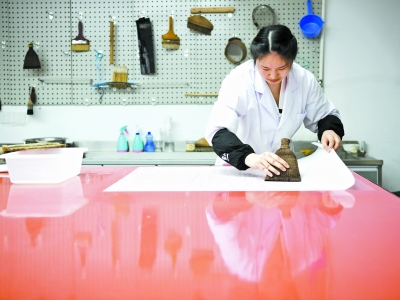 在四川西部文献修复中心,唐陈韵准备修复用的托纸(4月19日摄)。    “95后”姑娘唐陈韵大学毕业后进入四川西部文献修复中心,成为一名古籍修复师,从事古籍善本、书画、档案文书、碑帖拓片等文献物品修复。    拆线、配纸、调浆糊、托裱……古籍修复至少需要20多道工序,在唐陈韵眼中,每一次重复这些工序都是在了解一段新故事。    唐陈韵说,前辈们对文物的保护与坚持常常让她感动,作为新一代古籍修复师,更应该加快速度,修补好每一件受损的纸质文物,让它们能够更好地保存下去,让大家能够了解更多的历史。    新华社记者 胥冰洁/摄
