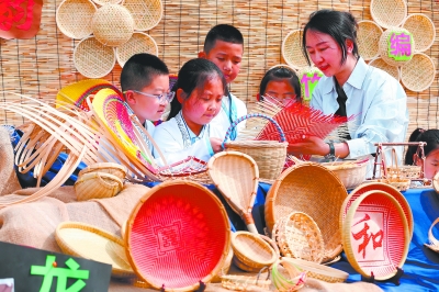 4月28日,山东省青岛市即墨区龙山中心小学的学生在非遗传承人的指导下学习竹编。    “五一”国际劳动节临近,各地开展丰富多彩的活动。  新华社发 梁孝鹏摄