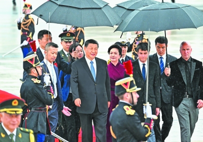 习近平主席夫人彭丽媛,中共中央政治局常委、中央办公厅主任蔡奇,中共中央政治局委员、外交部部长王毅等陪同人员同机抵达。