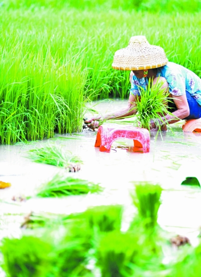 5月5日,村民在海南省三亚市天涯区槟榔村田间移秧苗。春生夏长,民间有“多插立夏秧,谷子收满仓”的说法。立夏时节,水稻栽插进入大忙季节。    新华社发(陈文武/摄)