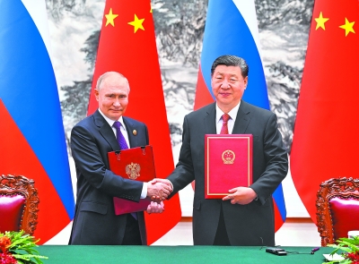 中俄两国同为联合国安理会常任理事国和主要新兴市场国家,双方加大战略协作,拓展互利合作,顺应世界多极化和经济全球化的历史大势,是两国共同的战略选择。双方应该以建交75周年为新起点,进一步加强发展战略对接,持续丰富双边合作内涵,更好造福两国和两国人民,为世界繁荣稳定贡献更多正能量。双方要进一步优化两国合作结构,巩固经贸等传统领域合作良好势头。打造更多人文交流亮点,共同办好“中俄文化年”,密切地方合作,持续拉紧民心纽带。加强在联合国、金砖国家、上海合作组织等国际多边平台以及地区事务中的沟通和协作,展现国际担当,推动建立公正合理的全球治理体系。