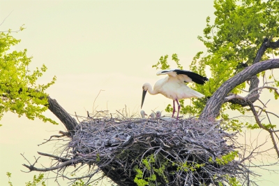 东方白鹳是国家一级保护动物,有“鸟界国宝”之称。一对东方白鹳“夫妇”近期在黑龙江扎龙国家级自然保护区克钦湖湿地的巢中“生儿育女”。