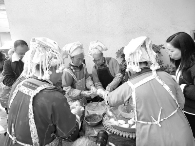 细寨村街上,聚集了十几个布依族同胞,正在舂打着糍粑,引来许多游客参观。刚舂打出的糍粑还有余热,包上黑黍子粉和花生粉后,被捏成一个圆形的块状,即制作完成。