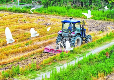5月23日,农民驾驶农机在浙江省宁波市鄞州区东吴镇的农田里耕地,准备种水稻(无人机照片)。    “三夏”时节,农民们抢收小麦、抢插水稻,田间地头一派繁忙劳作的景象。新华社发(胡学军/摄)