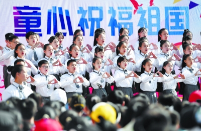 5月30日,河北省石家庄晋州市实验小学的学生在表演大合唱。 “六一”国际儿童节临近,各地开展丰富多彩的活动,让孩子们在欢声笑语中迎接自己的节日。 新华社发(张晓峰/摄)