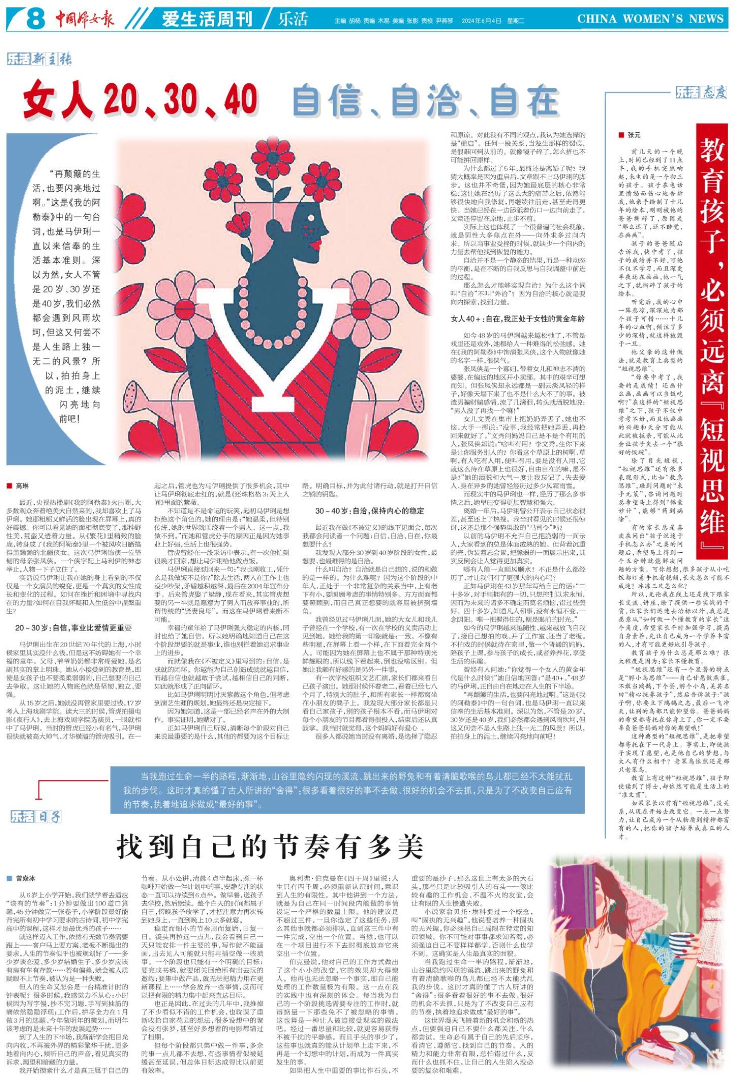 《中国妇女报》(电子版)的一切内容(包括但不限于文字、图片、PDF、图表、标志、标识、商标、版面设计、专栏目录与名称、内容分类标准以及为读者提供的任何信息)仅供中国妇女报读者阅读、学习研究使用,未经中国妇女报及/或相关权利人书面授权,任何单位及个人不得将《中国妇女报》(电子版)所登载、发布的内容用于商业性目的,包括但不限于转载、复制、发行、制作光盘、数据库、触摸展示等行为方式,或将之在非本站所属的服务器上作镜像。否则,中国妇女报将采取包括但不限于网上公示、向有关部门举报、诉讼等一切合法手段,追究侵权者的法律责任。