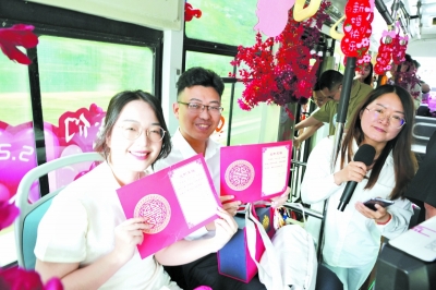 在不久前的“5·20”,三门县有10余对新人早早地来到县民政局婚姻登记处,参加“粉色相约·见证幸福”特色婚礼活动。在完成简单庄重的结婚仪式后,新人乘坐“心动巴士”前往粉色沙滩打卡。只见他们乘坐的公交车车身呈现喜庆的红色,车窗上张贴着大红喜字和“情定一生”等爱情蜜语,车厢内,一束束火红花束缠绕着扶手,拉环处悬挂着一张张写有“新婚快乐”字样的挂件,整辆公交车仿佛都冒着“粉红泡泡”。
