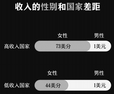 即使女性实现了就业,她们的收入也往往远低于男性,尤其是在低收入国家。在高收入国家,如果男性收入1美元,女性的收入仅为73美分,而在低收入国家,这一数字降至44美分。