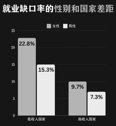 低收入国家女性的就业缺口率达到惊人的22.8%,男性为15.3%,这与高收入国家形成了鲜明对比——在这些国家,女性和男性的就业缺口率分别为9.7%和7.3%。