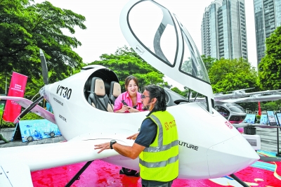 6月3日,工程师向观众讲解亿航智能VT-30无人驾驶载人航空器。    近日,一场低空航展在广州天德广场举行,十余架明星eVTOL(电动垂直起降飞行器)机型集中亮相,进行静态展示。日前广州发布《广州市低空经济发展实施方案》,本次航展是国内低空经济相关企业助力推动广州成为国内首个载人飞行商业化运营城市的积极行动。  新华社记者