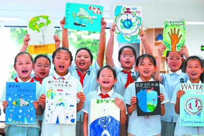 6月5日,学生在河北省石家庄市柏林庄学校展示自己创作的世界环境日主题绘画作品。当日是世界环境日,各地开展多样活动,保护生态环境,守护美丽家园。新华社发 陈其保/摄