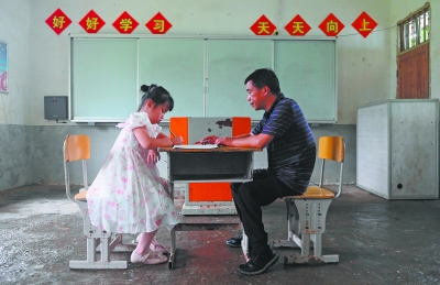 6月12日,在广西灵川县灵田镇上长岗教学点,陈建国(右)在给唯一的学生刘佳欢辅导功课。    一所学校,一位老师,一名学生……已经坚守莽莽大山讲台36年的陈建国,继续守望这片大山,守望教书育人的初心。    现年58岁的陈建国是广西灵川县灵田镇上长岗教学点唯一的教师,他在一岁半时因小儿麻痹症落下三级残疾。1988年,成为一名教师后,他回到小学一、二年级曾就读的灵川县灵田镇上长岗教学点教书,至今36年没离开。    灵田镇上长岗教学点师生最多时曾有9名老师180多名学生。2015年,随着学生逐年减少,其他老师都已调走,陈建国选择留守这里。上学期,这里只有一名7岁学生,陈建国每天从3公里外的家里来到教学点给学生上课,不敢有半点懈怠。    还有两年时间就退休了,回望36年如一日的坚守,陈建国没有半点遗憾。他说,“坚守大山让更多孩子走出大山是我最大的心愿”。