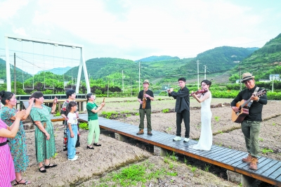 6月15日,浙江省建德市三都镇镇头村的村民乐队乐手和杭州师范大学音乐学院的学生(右二、右三)在田间为村民即兴演出。这是建德市委宣传部和杭州师范大学音乐学院合作的首场乡村音乐会,同时也是三都镇2024乡村音乐学校开班仪式。    近年来,浙江省建德市积极推进艺术乡村建设,选派文艺、文化领域的专业人员到有需求的乡村服务。建德市三都镇积极响应,以乡村音乐学校为载体,深化与杭州师范大学音乐学院合作共建,通过专业院校老师的指导,带领群众主动参加文艺活动。新华社记者 徐昱/摄