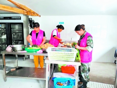 临安区清凉峰镇妇联组织巾帼志愿者在村委老年食堂为转移人员准备晚餐。清凉峰镇妇联供图
