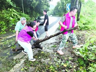 临安区板桥镇巾帼志愿者参与防汛巡查,清理路障。
