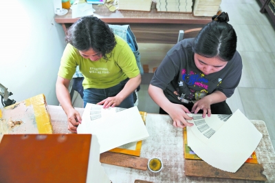 ▲在金陵刻经处技艺展示区,工作人员在齐栏。