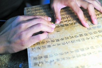 ▲在金陵刻经处技艺展示区,工作人员在刻版。