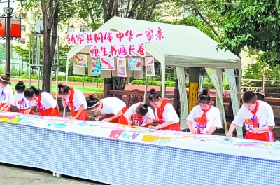 国旗、长城、各族儿童手拉手……内蒙古自治区兴安盟红城小学校园内,十几名书画社团的孩子正一字排开,共绘一幅《铸牢共同体 中华一家亲》主题长卷。长卷不仅包括主题画作,还有孩子们的蒙汉书法作品,书法作品字形不同、内涵却一致:籽籽同心、石榴花开。