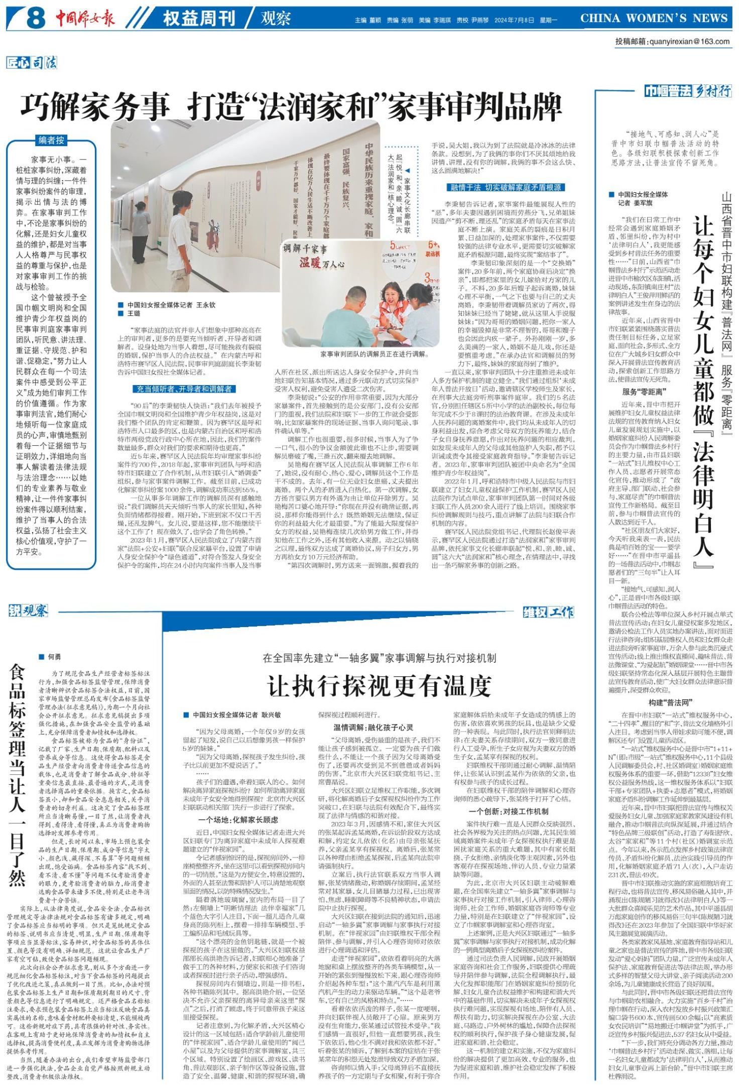 《中国妇女报》(电子版)的一切内容(包括但不限于文字、图片、PDF、图表、标志、标识、商标、版面设计、专栏目录与名称、内容分类标准以及为读者提供的任何信息)仅供中国妇女报读者阅读、学习研究使用,未经中国妇女报及/或相关权利人书面授权,任何单位及个人不得将《中国妇女报》(电子版)所登载、发布的内容用于商业性目的,包括但不限于转载、复制、发行、制作光盘、数据库、触摸展示等行为方式,或将之在非本站所属的服务器上作镜像。否则,中国妇女报将采取包括但不限于网上公示、向有关部门举报、诉讼等一切合法手段,追究侵权者的法律责任。
