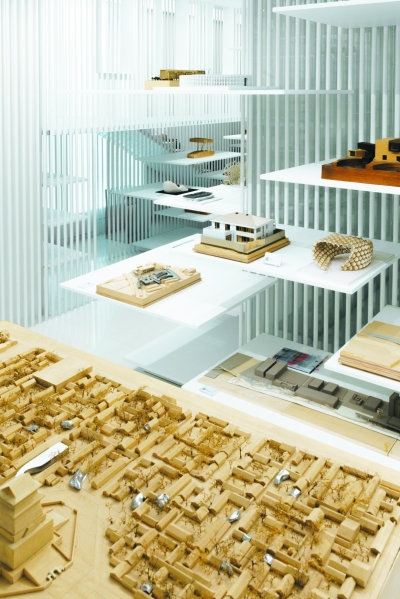在建筑模型博物馆里,每个模型都被设计师俞挺融入“未来城市”的肌理。俞挺设计场馆时选择垂直城市模型,用直径32mm的圆杆作为基本元素来构筑,结构柱和装饰柱在尺寸和视觉上保持一致,连续形成序列后成为垂直城市不同区域的分隔界面。在这里,参观者可以透过建筑看建筑,方圆不一的模型被布置在高高低低的空间里,起起伏伏,错落有致。