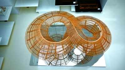 参观者随着讲解员的脚步边走边看,沉浸其中。记者发现,似乎不管走在哪个角度,都能隐隐约约看到一个被置于显眼位置、造型奇特的建筑模型,俯瞰下来,形状似一个横卧的数字“8”,也似一个无穷符号“∞”。“这个特别的形状设计有着向外无限延伸,不断探索的寓意。”冷彦讲解道。这个竹编而成的作品是多次斩获国际建筑大奖的同济大学教授袁烽在川西林盘村落中改造的“网红建筑”——竹里的模型,其建筑物位于成都崇州道明镇龙黄村。