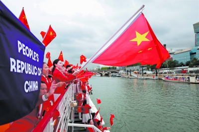 7月26日,中国体育代表团旗手、花样游泳选手冯雨在开幕式上挥舞国旗。 当日,第33届夏季奥林匹克运动会开幕式在法国巴黎举行。 新华社记者 曹灿/摄