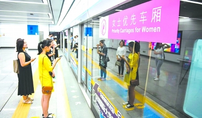 深圳地铁3号线福田站站台,女性乘客在女士优先车厢候车区域等候列车。毛思倩/摄