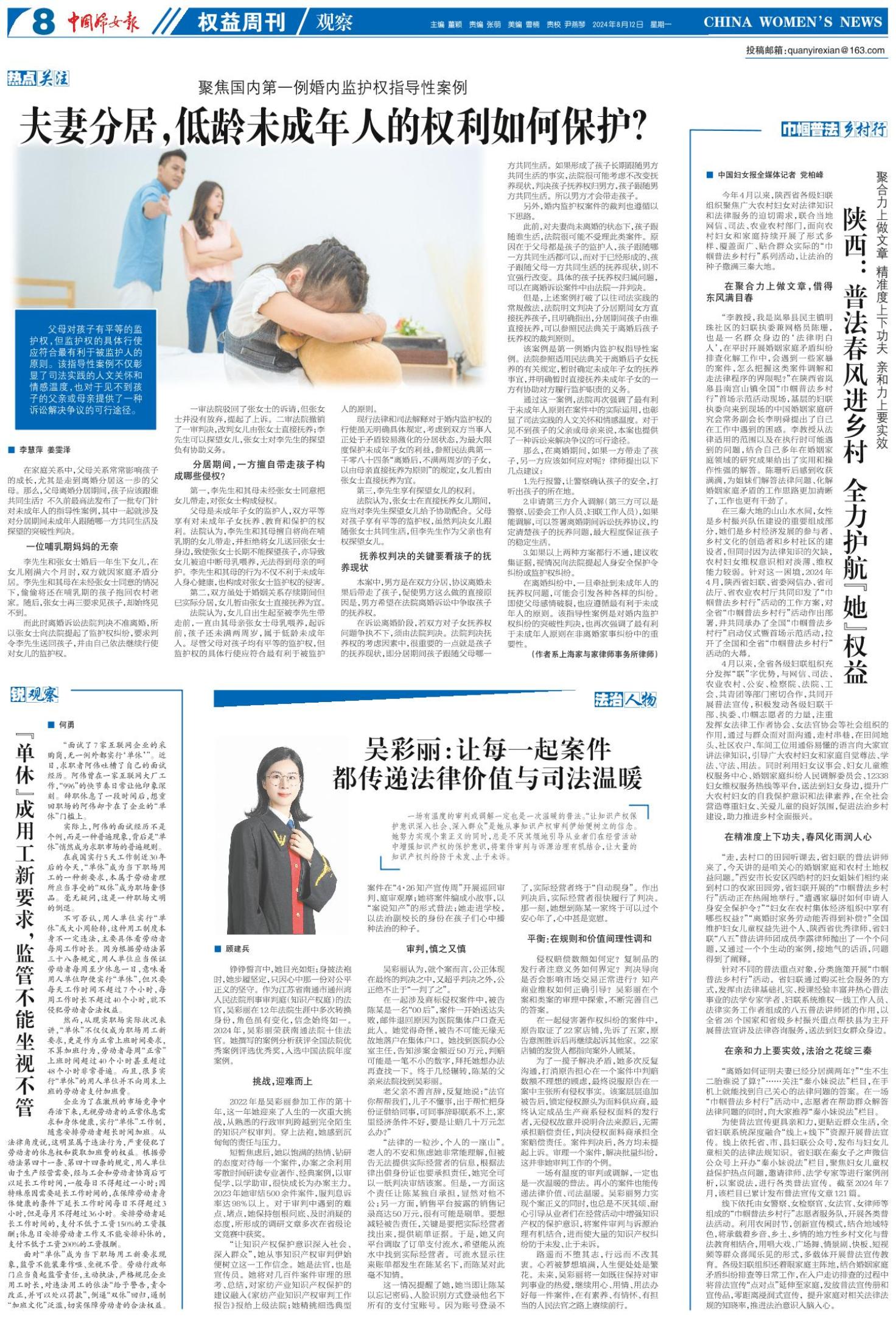 《中国妇女报》(电子版)的一切内容(包括但不限于文字、图片、PDF、图表、标志、标识、商标、版面设计、专栏目录与名称、内容分类标准以及为读者提供的任何信息)仅供中国妇女报读者阅读、学习研究使用,未经中国妇女报及/或相关权利人书面授权,任何单位及个人不得将《中国妇女报》(电子版)所登载、发布的内容用于商业性目的,包括但不限于转载、复制、发行、制作光盘、数据库、触摸展示等行为方式,或将之在非本站所属的服务器上作镜像。否则,中国妇女报将采取包括但不限于网上公示、向有关部门举报、诉讼等一切合法手段,追究侵权者的法律责任。