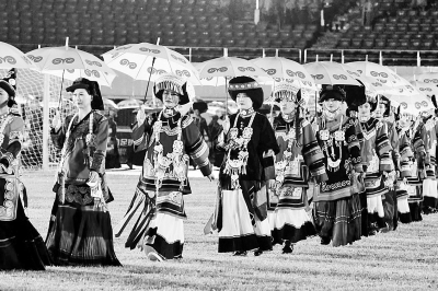 流动的黄伞、绽放的彩裙、夺目的银饰……妈妈和女儿们手持黄油伞,身着彝家百褶裙,踩着细碎而富有韵味的舞步,在碧绿的草坪上围成一圈又一圈,远看如一朵朵黄花接连绽放,这就是彝家美女的“朵洛荷”表演。