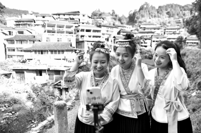 在融水苗族自治县杆洞乡尧告村,几名大学生在准备做直播。