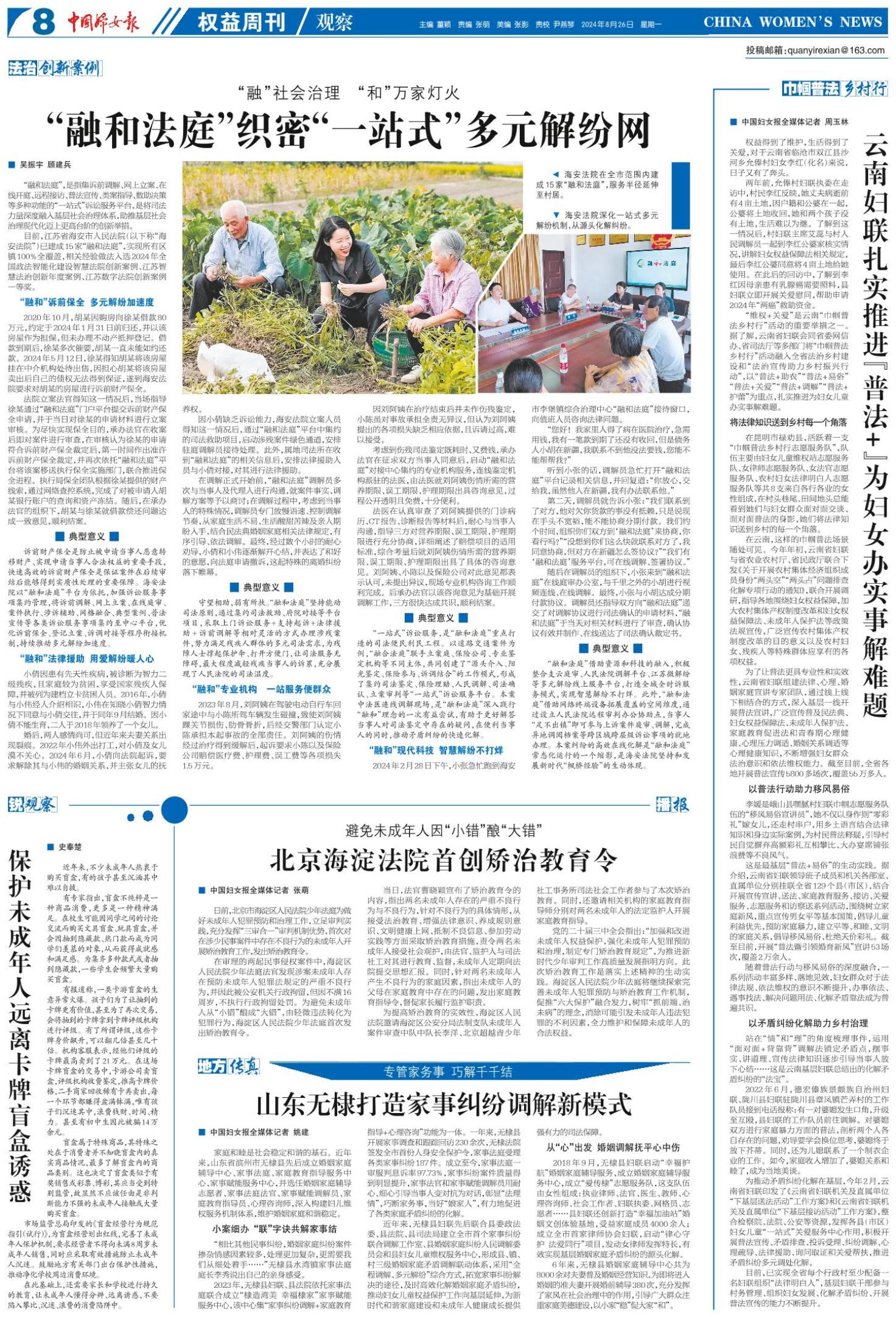 《中国妇女报》(电子版)的一切内容(包括但不限于文字、图片、PDF、图表、标志、标识、商标、版面设计、专栏目录与名称、内容分类标准以及为读者提供的任何信息)仅供中国妇女报读者阅读、学习研究使用,未经中国妇女报及/或相关权利人书面授权,任何单位及个人不得将《中国妇女报》(电子版)所登载、发布的内容用于商业性目的,包括但不限于转载、复制、发行、制作光盘、数据库、触摸展示等行为方式,或将之在非本站所属的服务器上作镜像。否则,中国妇女报将采取包括但不限于网上公示、向有关部门举报、诉讼等一切合法手段,追究侵权者的法律责任。