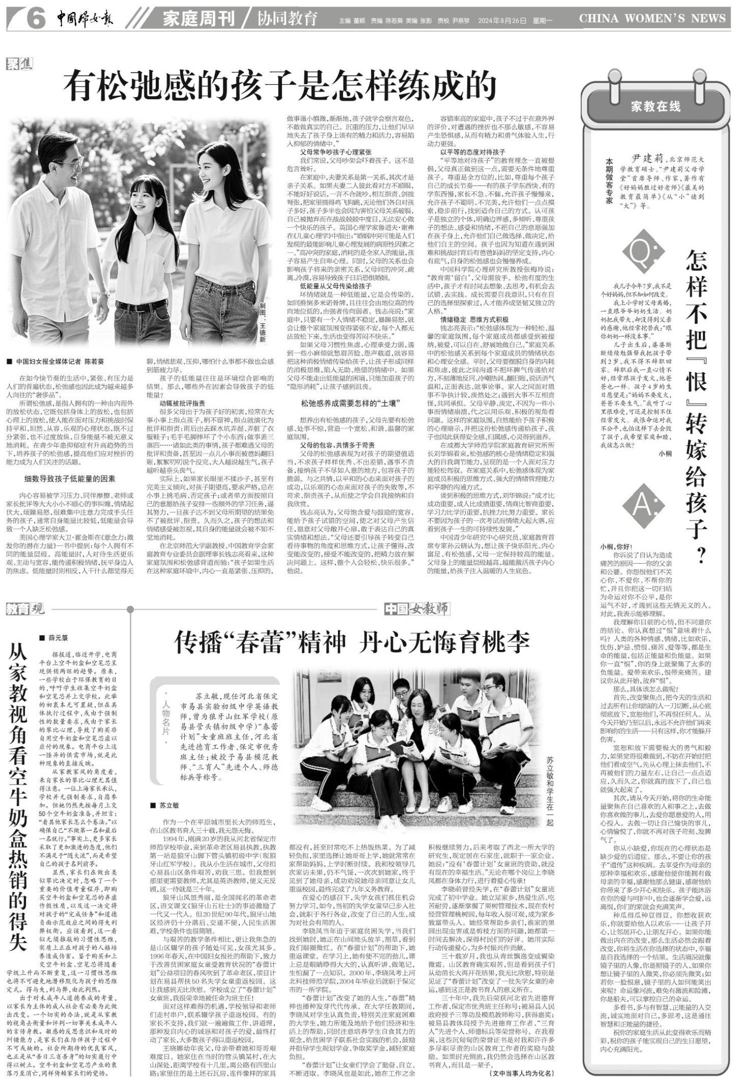 中国科学院心理研究所教授张梅玲说:“教育需‘留白’,父母需放手。松弛有度的生活中,孩子才有时间去想象、去思考,有机会去试错、去实践。成长需要自我意识,只有在自己的选择里探索过,人才能养成坚韧又独立的人格。”