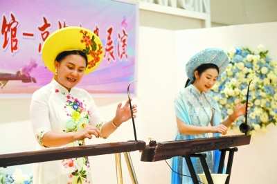 8月24日,在广西东兴京族博物馆,京族独弦琴艺术传承人赵霞(左)和阮媛媛在弹奏独弦琴。
