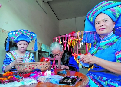 8月27日,在广西壮族自治区靖西市旧州古镇,壮族老人黄肖琴(中)一家四代三人在缝制绣球。靖西旧州是中国绣球之乡,年产绣球50多万个,产值近千万元。近年来,靖西市大力发展绣球“庭院经济”,带动农村女性就近就业和居家灵活就业,她们用勤劳的双手,传承绣球制作古老技艺,又在创新中编织出锦绣前程,实现“背着娃,绣着花,养着老,护着家”。 中国妇女报全媒体 记者高峰 文/摄