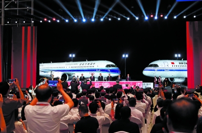 8月28日在中国商飞总装制造中心浦东基地拍摄的国产大飞机C919交付仪式现场。 当日,中国国际航空公司和中国南方航空公司在中国商飞总装制造中心浦东基地同时接收首架C919飞机。这标志着C919飞机即将开启多用户运营新阶段。新华社记者 方喆/摄