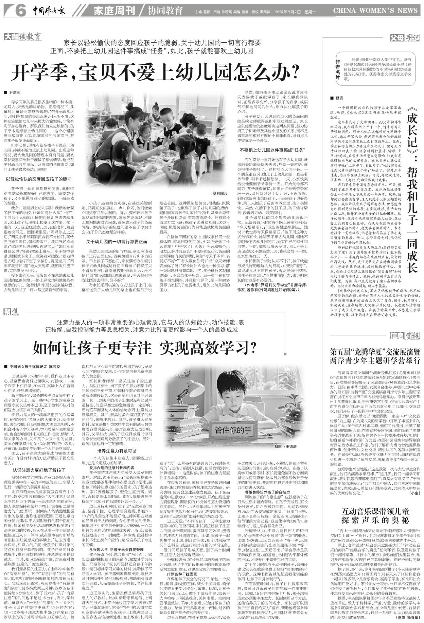 边玉芳提醒,在孩子游戏、活动时,家长不过度关心、问长问短,不催促,给孩子留有充足的时间和机会,应减少唠叨。在孩子认真学习或思考时,家长要避免因不放心而频繁进入房间查看,这些行为都会导致孩子专注的时间更短,并需要耗费更多的时间和精力再次进入状态。