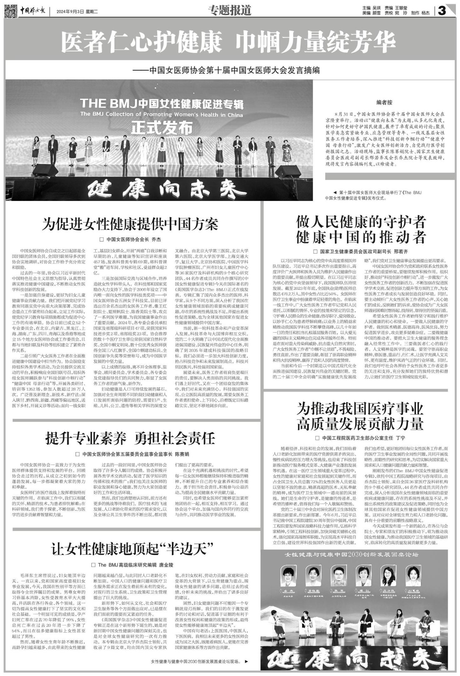 8月31日,中国女医师协会第十届中国女医师大会在京隆重举行。活动以“健康向未来”为主题,从多元化角度,针对如何更好守护国民健康,展开了卓有成效的讨论;聚焦医学类急需紧缺专业、应急管理等青年、 一线及基层女性医务工作者培养,深入推进“科技创新巾帼行动”“健康中国 母亲行动”,激发广大女医师创新活力、自觉践行医学创新报国之志。活动现场,监事长陈赛娟院士、国家卫生健康委员会医政司副司长邢若齐及会长乔杰院士等发表致辞,现将发言内容摘编刊发,以飨读者。