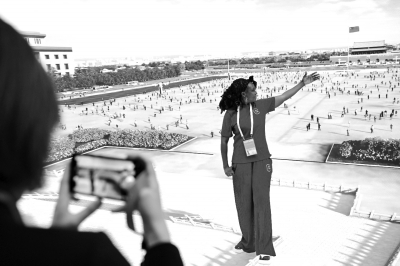 9月3日,在2024年中非合作论坛峰会新闻中心,一名外国媒体记者在CAVE 8K超高清沉浸式体验中游览北京。 中国妇女报全媒体记者 杨睿/摄