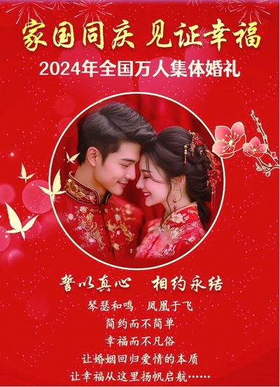 2024年全国万人集体婚礼既是庆祝新中国成立75周年的一场盛大活动,又是新时代中国家庭生活中的一件大事,是万人组建小家庭的喜事。习近平总书记关于家庭家教家风建设的重要论述所形成的新时代家庭观和社会主义家庭文明新风尚,是新时代婚育文化的根基。要通过构建新型婚育文化,让“亲”“孝”“和”的家庭观念植入年轻人的心中,让他们相信婚姻爱情、愿意结婚、乐意为家庭共同付出。而万人集体婚礼,恰恰向社会传递了积极向上的婚恋观、家庭观,倡导新时代新型婚育文化,引导广大群众做婚俗改革的参与者。这样的移风易俗的实践活动贴近群众、深入人心。